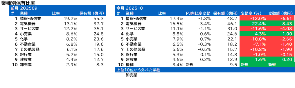 業種別保有比率に変動がありました。
