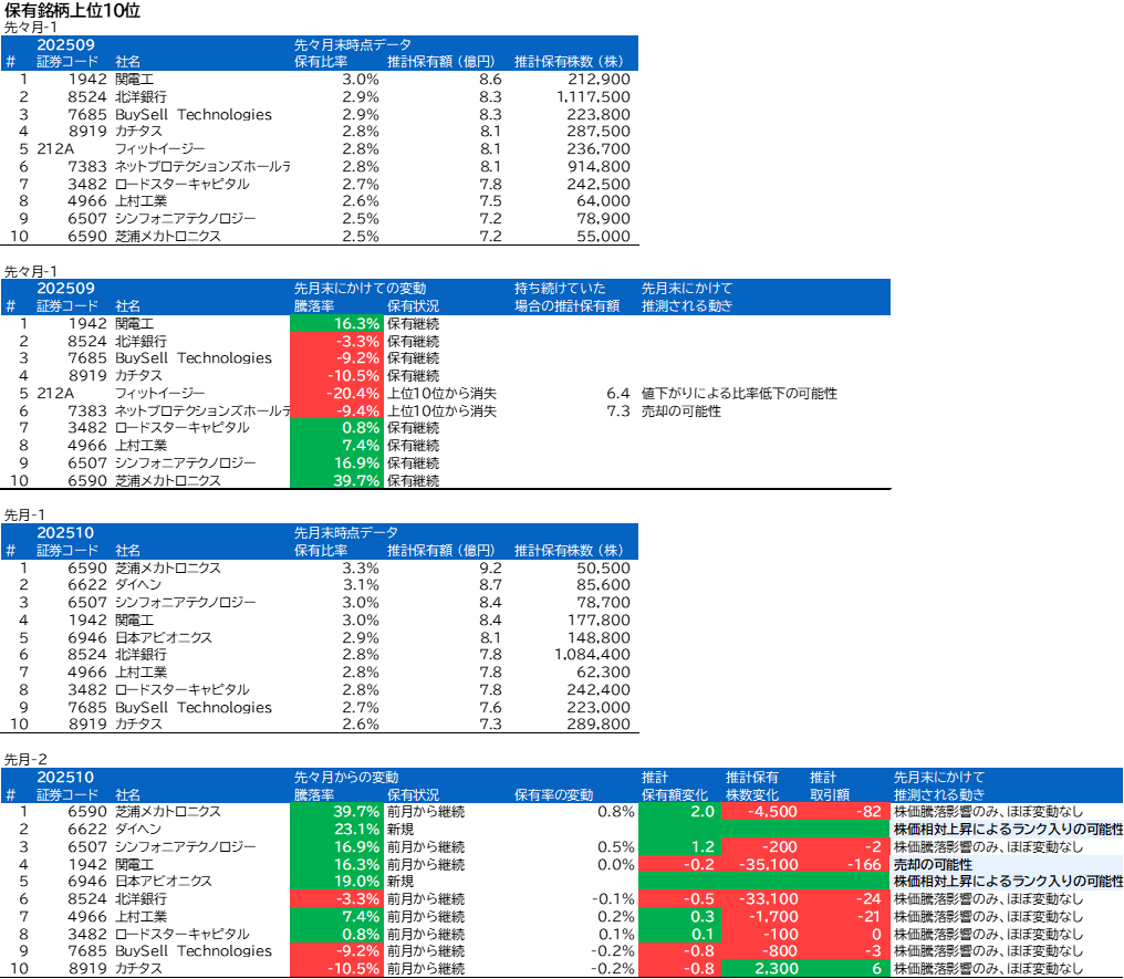 フィットイージー、ネットプロテクションズホールディングス、ダイヘン、日本アビオニクスについて、組入上位銘柄の変動がありました。