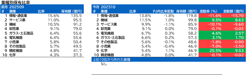 サービス業、ガラス・土石製品、小売業、精密機器の保有比率がPF内で下がりました。