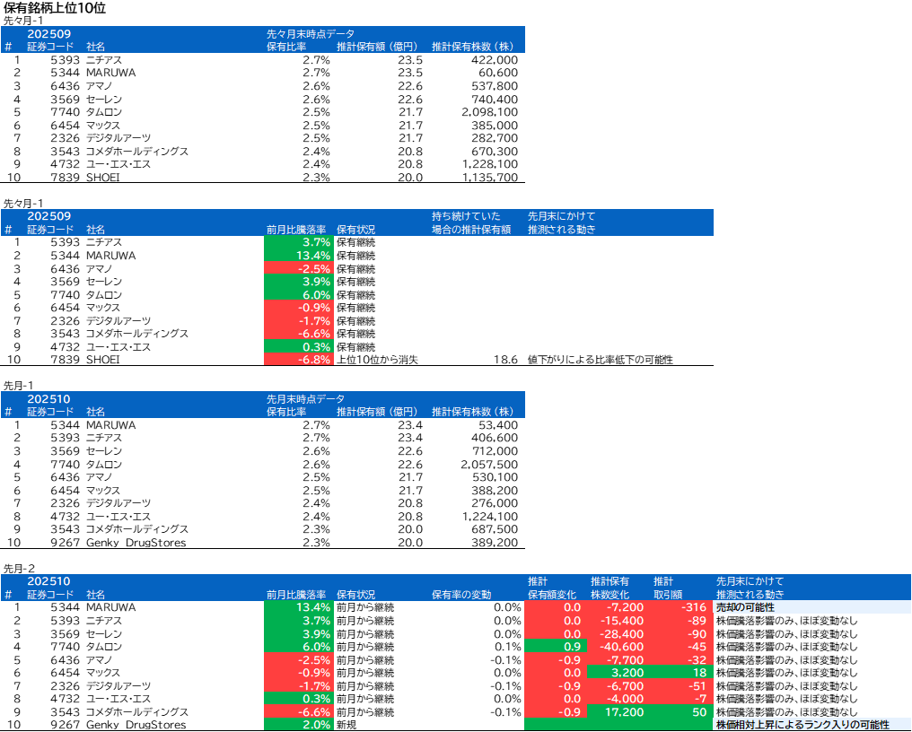 SHOEI、Genky DrugStoresについて、組入上位銘柄の変動がありました。