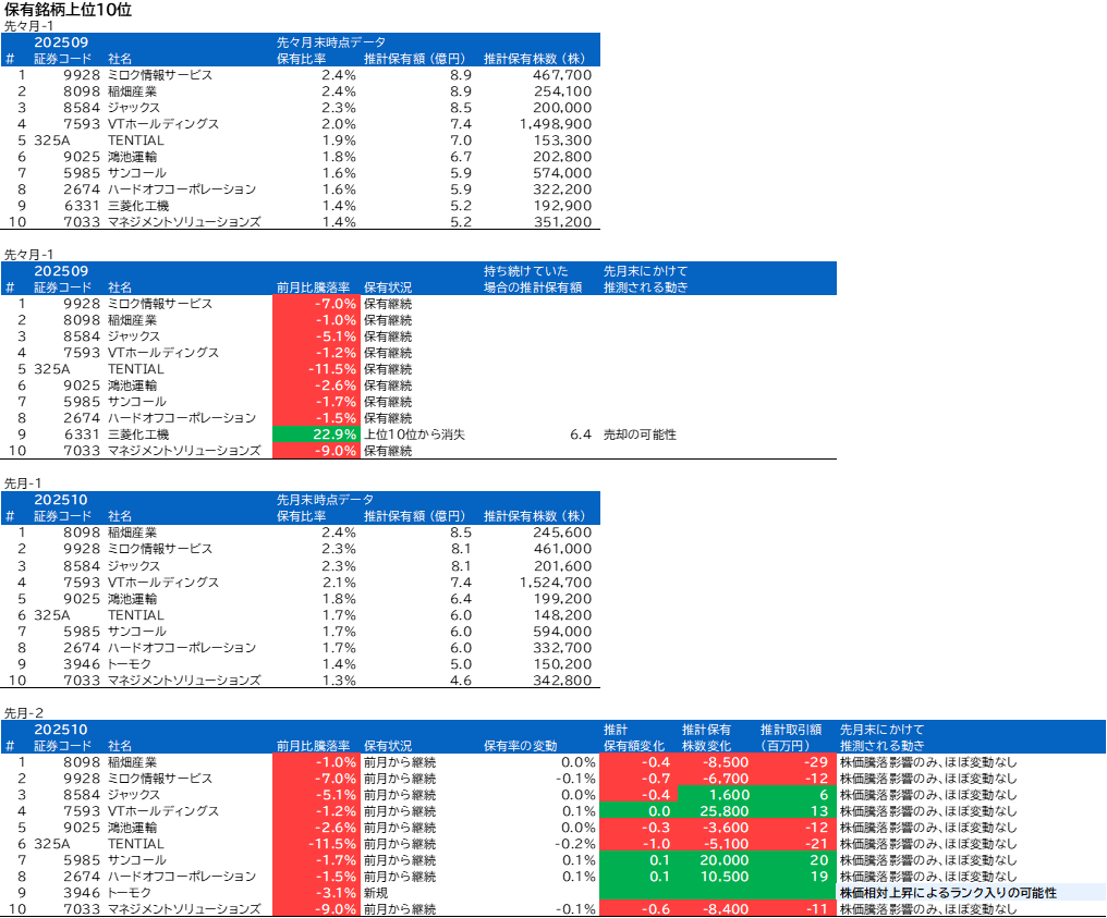 先月の保有9位の三菱化工機は、今月の保有上位10銘柄には入っていませんでした。評価額減ではなく、売却があったと思われます。