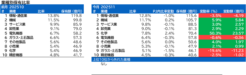 業種別保有比率に変動がありました。