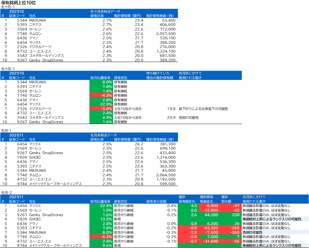 先月の保有内1位のMARUWAは今月は7位でした。騰落率と保有額からの推計によると売却があったと思われます。