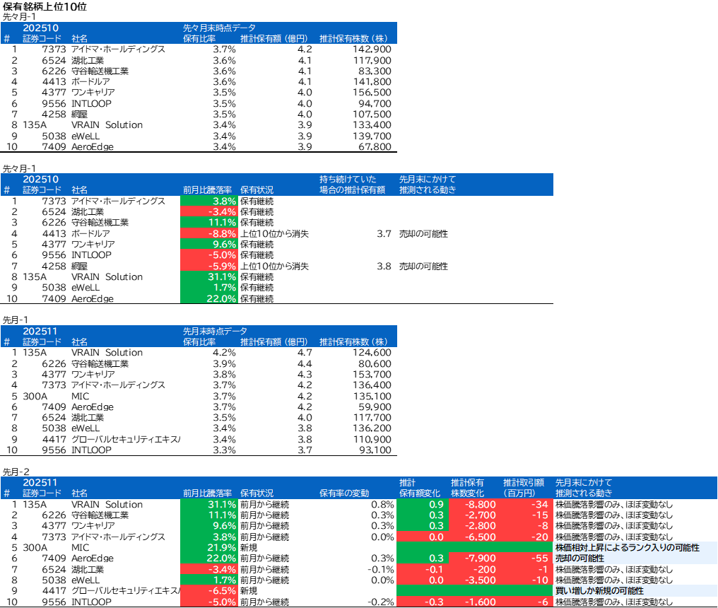 ボードルア、網屋、MIC、グローバルセキュリティエキスパートについて、組入上位銘柄の変動がありました。
