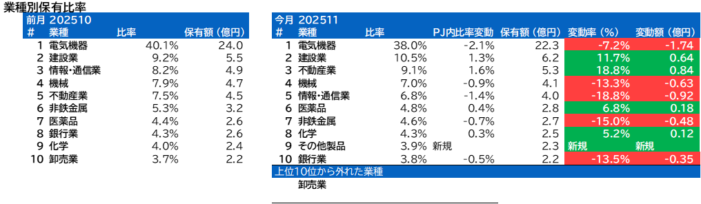 業種別保有比率に変動がありました。