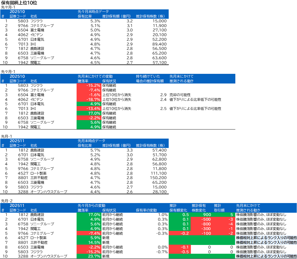 富士電機、イビデン、IHI、ロート製薬、三井不動産、オープンハウスグループについて、組入上位銘柄の変動がありました。