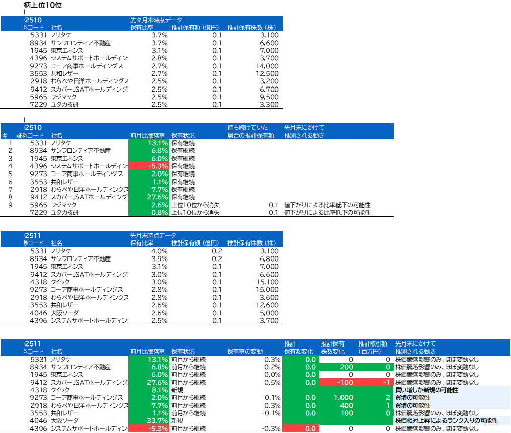 フジマック、ユタカ技研、クイック、大阪ソーダについて、組入上位銘柄の変動がありました。