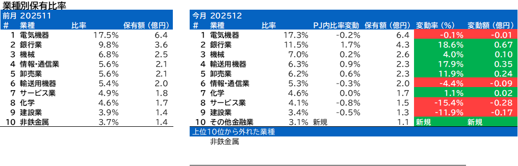 業種別保有比率に変動がありました。