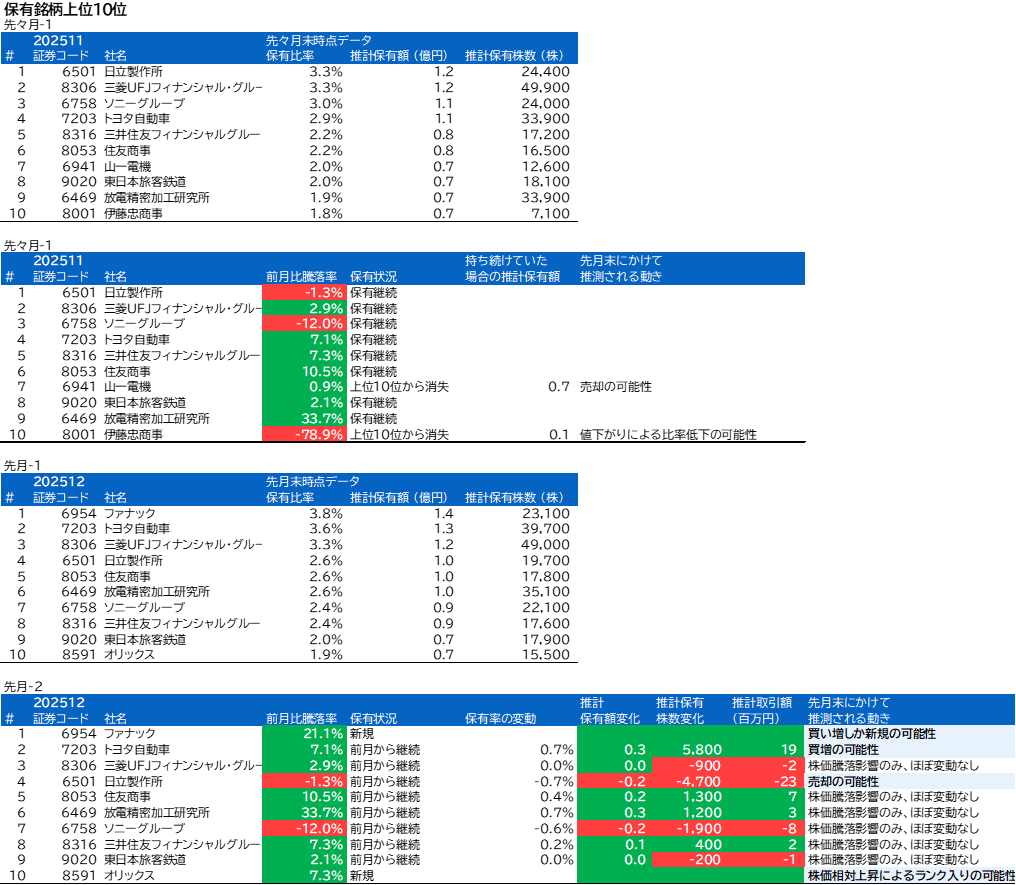 山一電機、伊藤忠商事、ファナック、オリックスについて、組入上位銘柄の変動がありました。