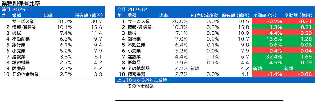 業種別保有比率に変動がありました。