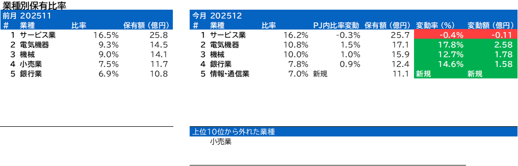 電気機器の保有比率はPF内2位で変わりませんでしたが業種指数の変動以上に大きく上昇しました。