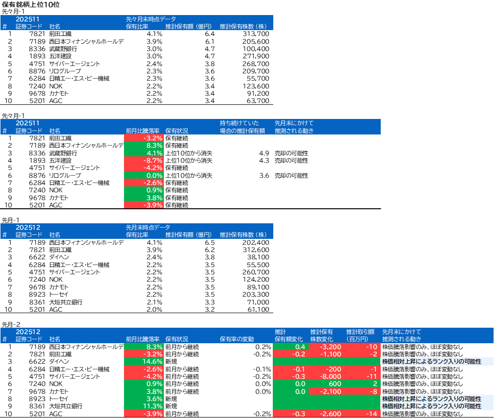 武蔵野銀行、五洋建設、リログループ、ダイヘン、トーセイ、大垣共立銀行について、組入上位銘柄の変動がありました。