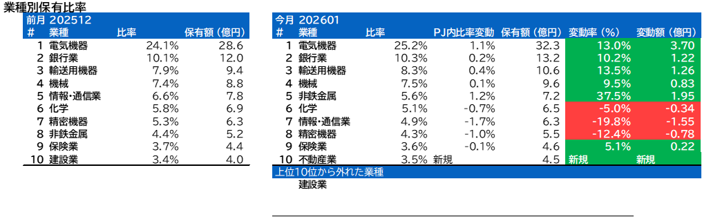 電気機器の保有比率はPF内1位で変わりませんでしたが業種指数の変動以上に大きく上昇しました。