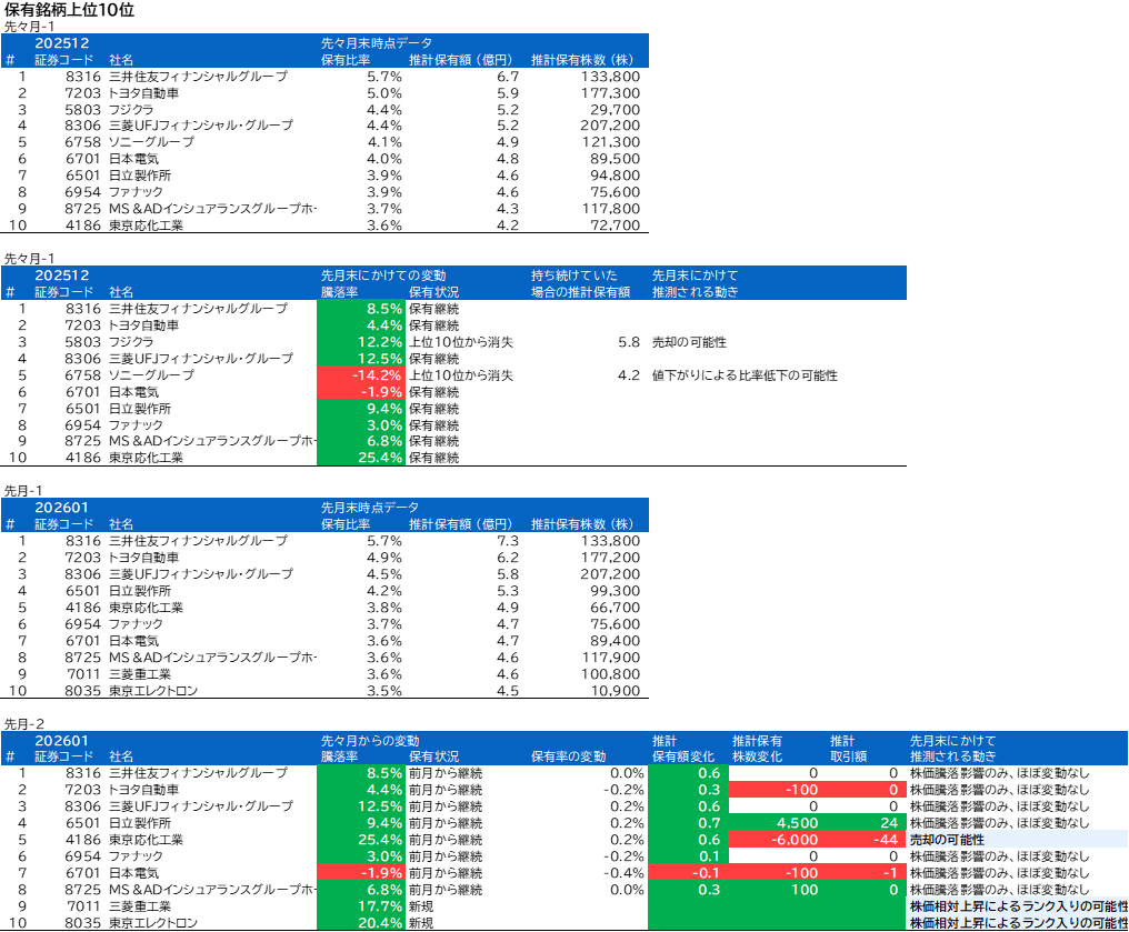 フジクラ、ソニーグループ、三菱重工業、東京エレクトロンについて、組入上位銘柄の変動がありました。