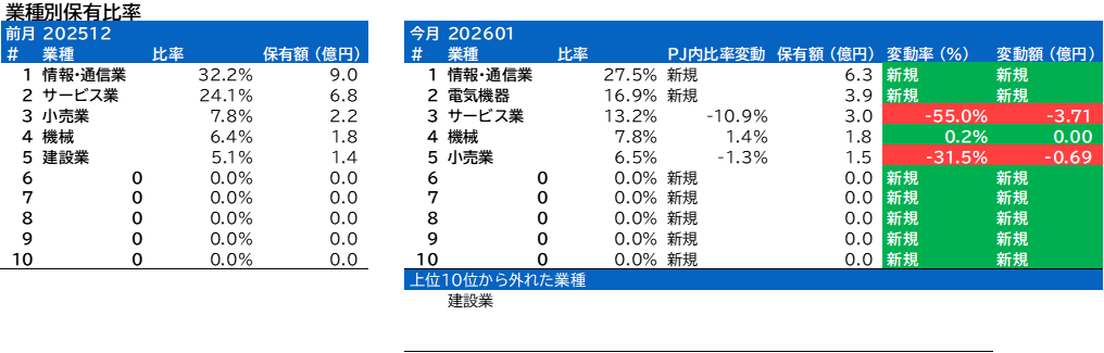 業種別保有比率に変動がありました。