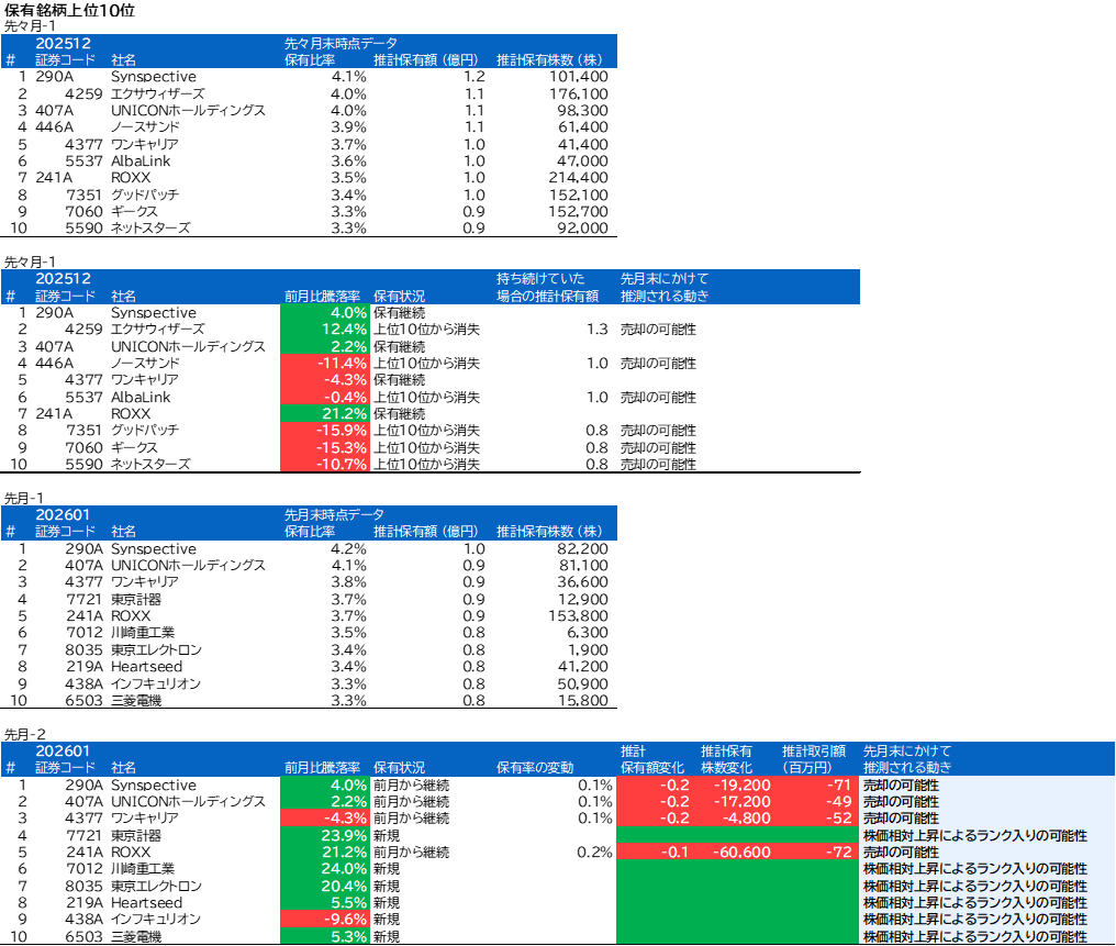先月の保有内1位のSynspectiveは今月も1位でしたが、騰落率と保有額からの推計によると売却があったと思われます。