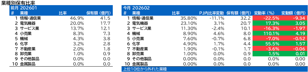 電気機器の保有比率はPF内2位で変わりませんでしたが業種指数の変動以上に大きく上昇しました。