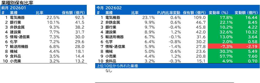 小売業の保有比率がPF内10位からPF内9位に上がり、業種指数の変動以上に大きく上昇しました。