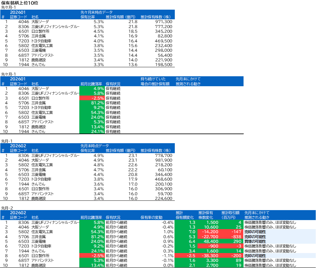 先月の保有内4位の三井金属は今月も4位でしたが、騰落率と保有額からの推計によると売却があったと思われます。