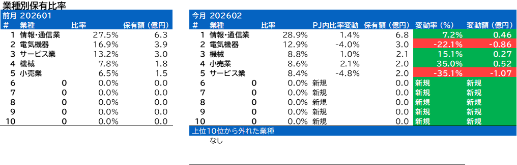 業種別保有比率に変動がありました。