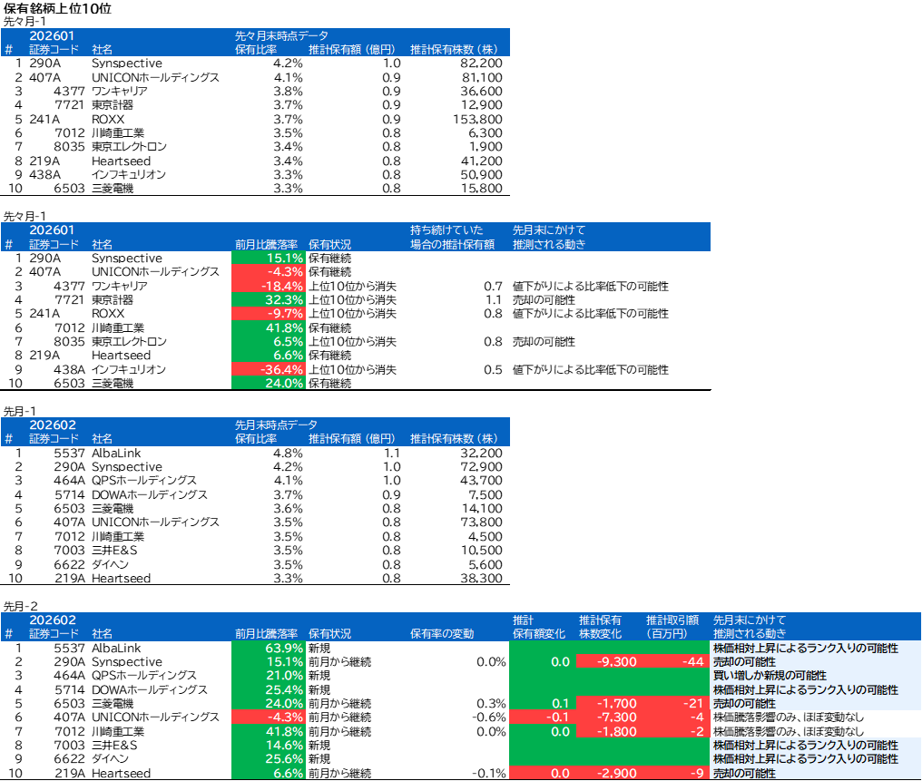 ワンキャリア、東京計器、ROXX、東京エレクトロン、インフキュリオン、AlbaLink、QPSホールディングス、DOWAホールディングス、三井E&S、ダイヘンについて、組入上位銘柄の変動がありました。