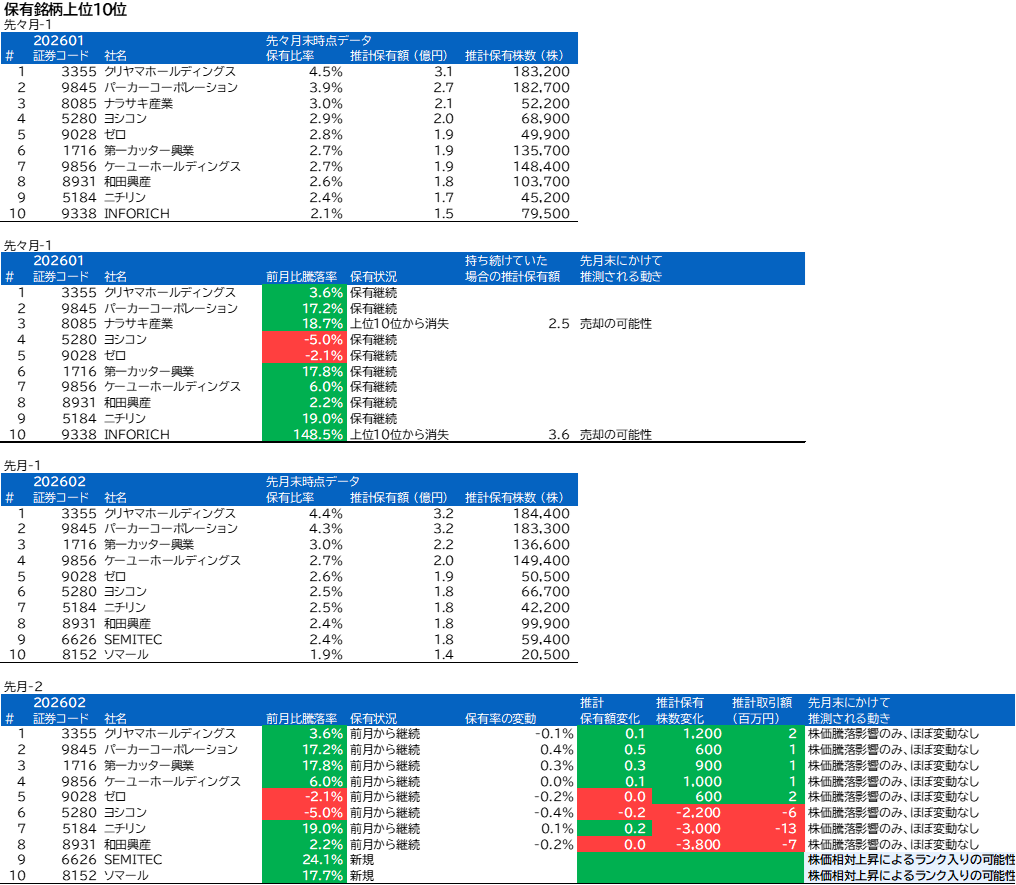 ナラサキ産業、INFORICH、SEMITEC、ソマールについて、組入上位銘柄の変動がありました。